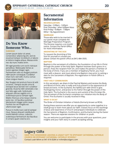 Bulletin designed for the Epiphany Cathedral Catholic Church in Venice, Florida.