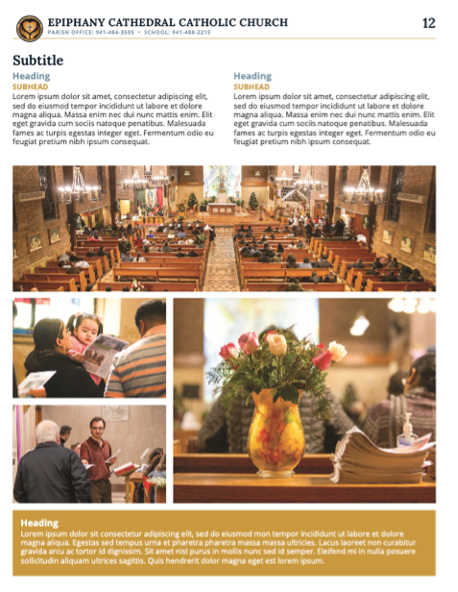 Another component to having a successful publication is the customers’ overall branding and their color scheme. In this bulletin, St. Mary’s already had a beautiful logo and brand colors chosen upfront, which made the design portion much easier and enjoyable! To see their logo come to life through their bulletin makes for a much greater impact than if the parish didn’t have those elements established.